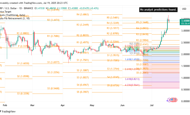 Rallying with a steep move, XRP is currently at $3.42 following a 25.35% increase in the last seven days. On the day, the token reached a peak at $3.4865, rising above previous resistance zones, including $2.80 and $3.24. The price is now closing in on the R5 level at $3.5481, with intensity not witnessed in several months.