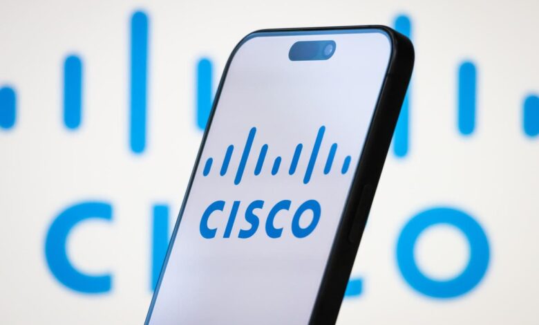 CHONGQING, CHINA – MAY 11: In this photo illustration, the logo of Cisco Systems, Inc. is displayed … More on a smartphone screen, with the company’s iconic blue branding visible in the background, on May 11, 2025, in Chongqing, China. (Photo illustration by Cheng Xin/Getty Images)