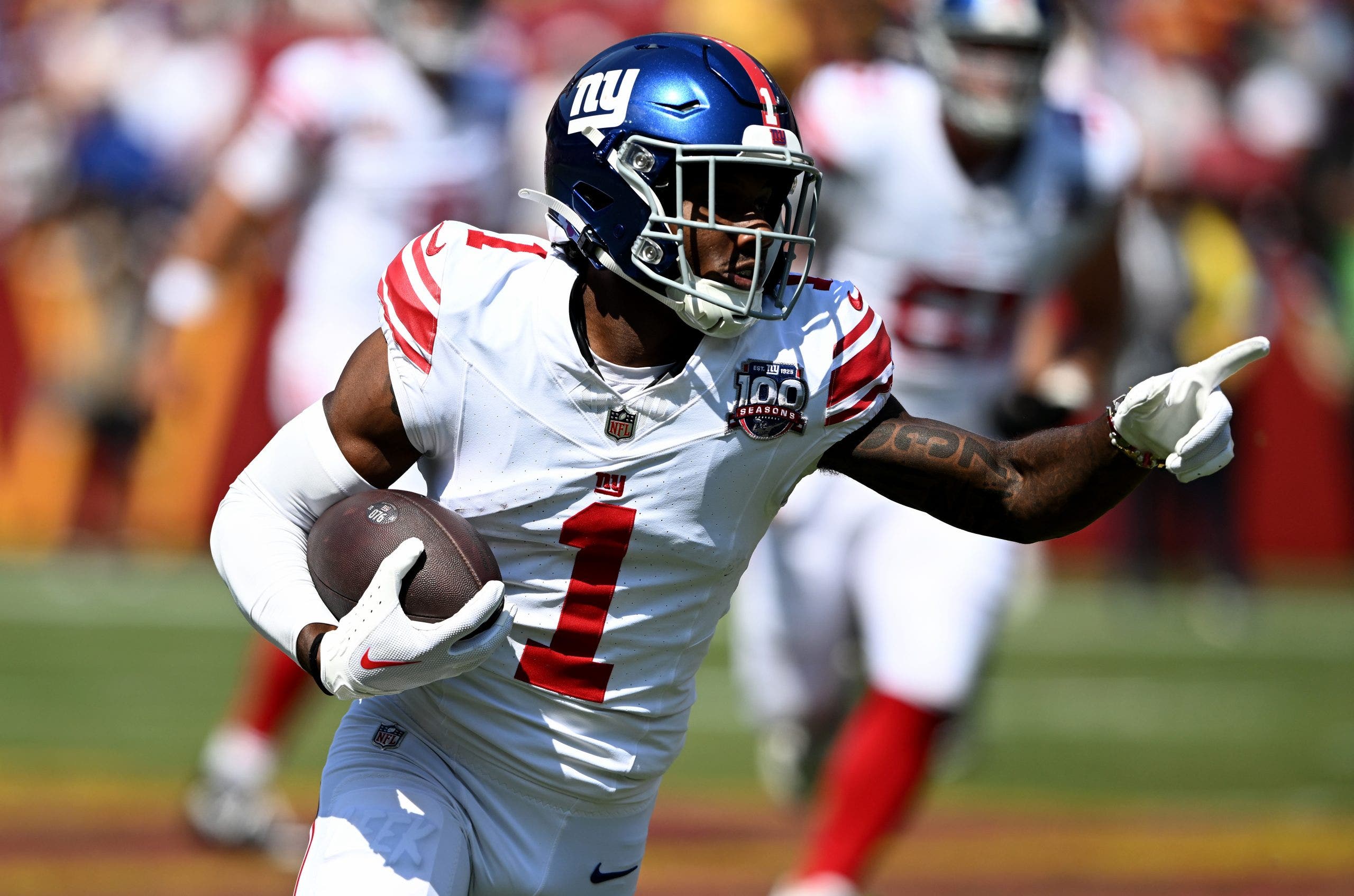 Malik Nabers #1 of the New York Giants runs with the ball after a catch against the Washington Commanders at Northwest Stadium on September 15, 2024 in Landover, Maryland. (Photo by G Fiume/Getty Images)