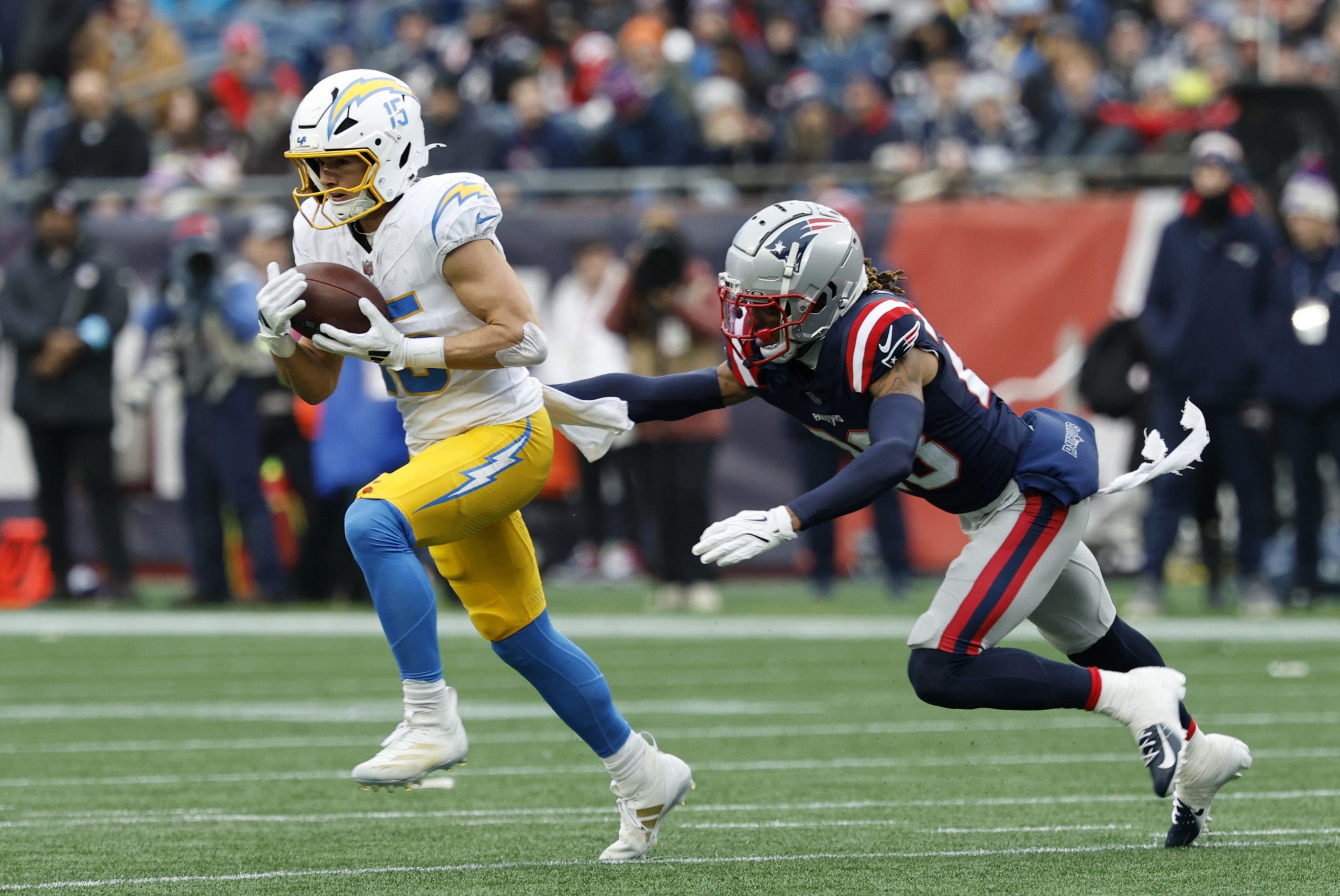 Los Angeles Chargers wide receiver Ladd McConkey (15) grabs a pass during a game between the New England Patriots and the Los Angeles Chargers on December 28, 2024, at Gillette Stadium in Foxborough, Massachusetts. (Photo by Fred Kfoury III/Icon Sportswire via Getty Images)