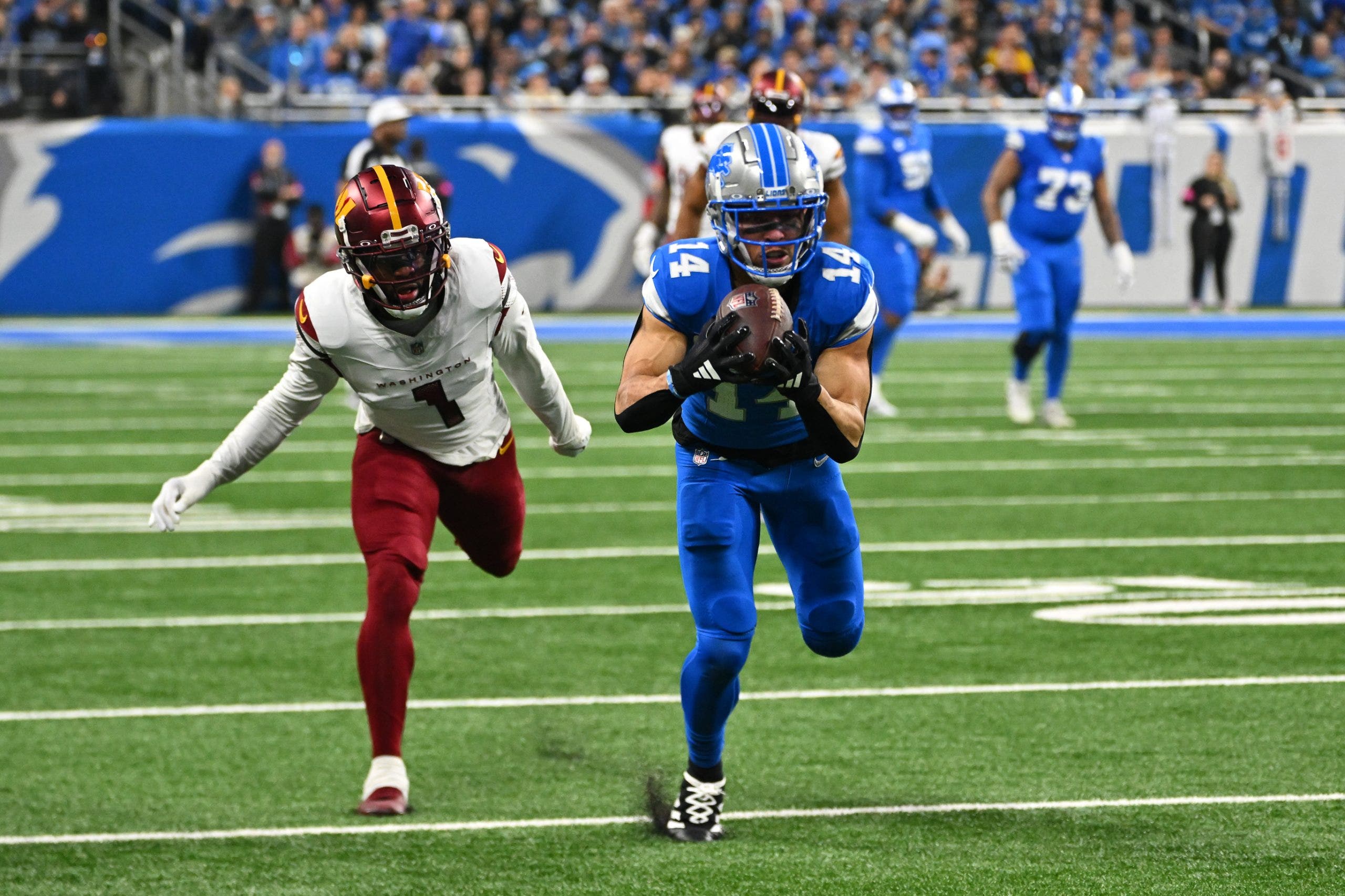 Detroit Lions wide receiver Amon-Ra St. Brown (14) makes an over the shoulder catch for a long first down during the NFC Divisional Playoff game against the Washington Commanders on Sunday January 18, 2025 at Ford Field in Detroit, MI. (Photo by Steven King/Icon Sportswire via Getty Images)