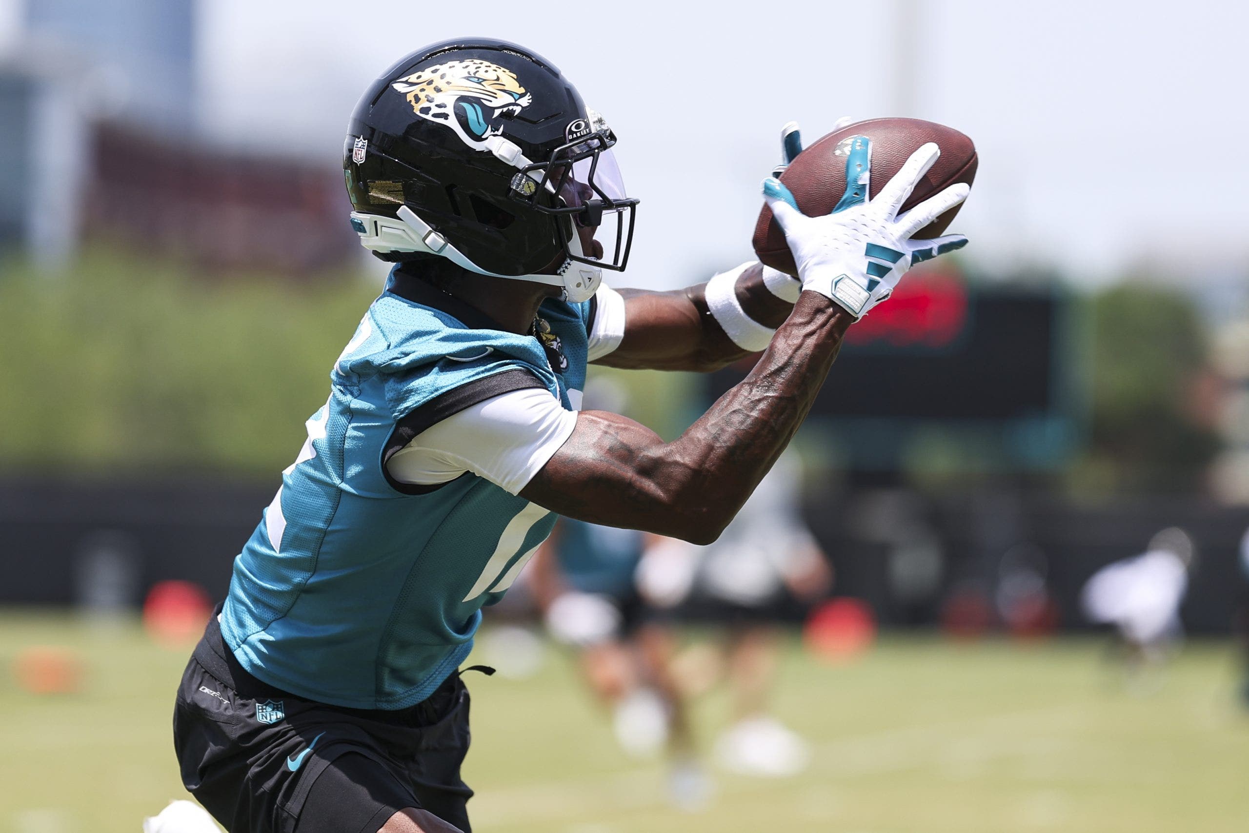 Travis Hunter #12 of the Jacksonville Jaguars catches a pass during an NFL football practice at Miller Electric Center on May 19, 2025 in Jacksonville, Florida. (Photo by Logan Bowles/Getty Images)