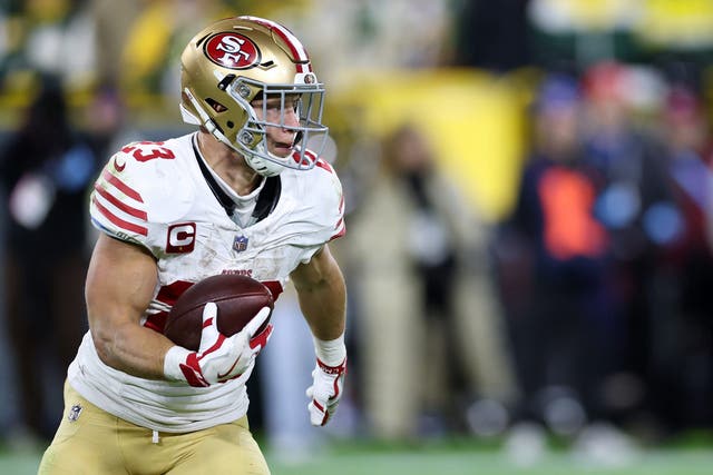 Christian McCaffrey #23 of the San Francisco 49ers runs for yards during a game against the Green Bay Packers at Lambeau Field on November 24, 2024 in Green Bay, Wisconsin. (Photo by Stacy Revere/Getty Images)