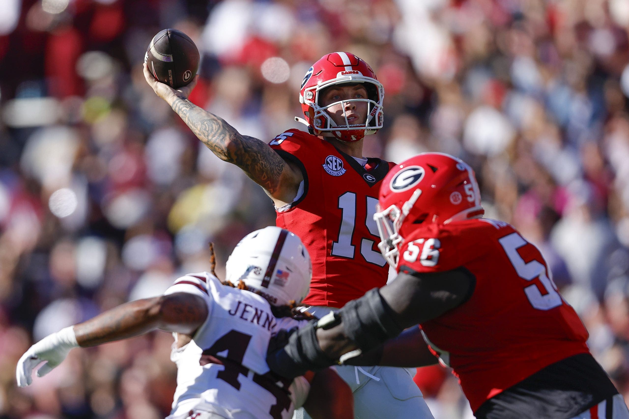 Georgia QB Carson Beck threw for over 300 yards in the first half of its win over Mississippi State.