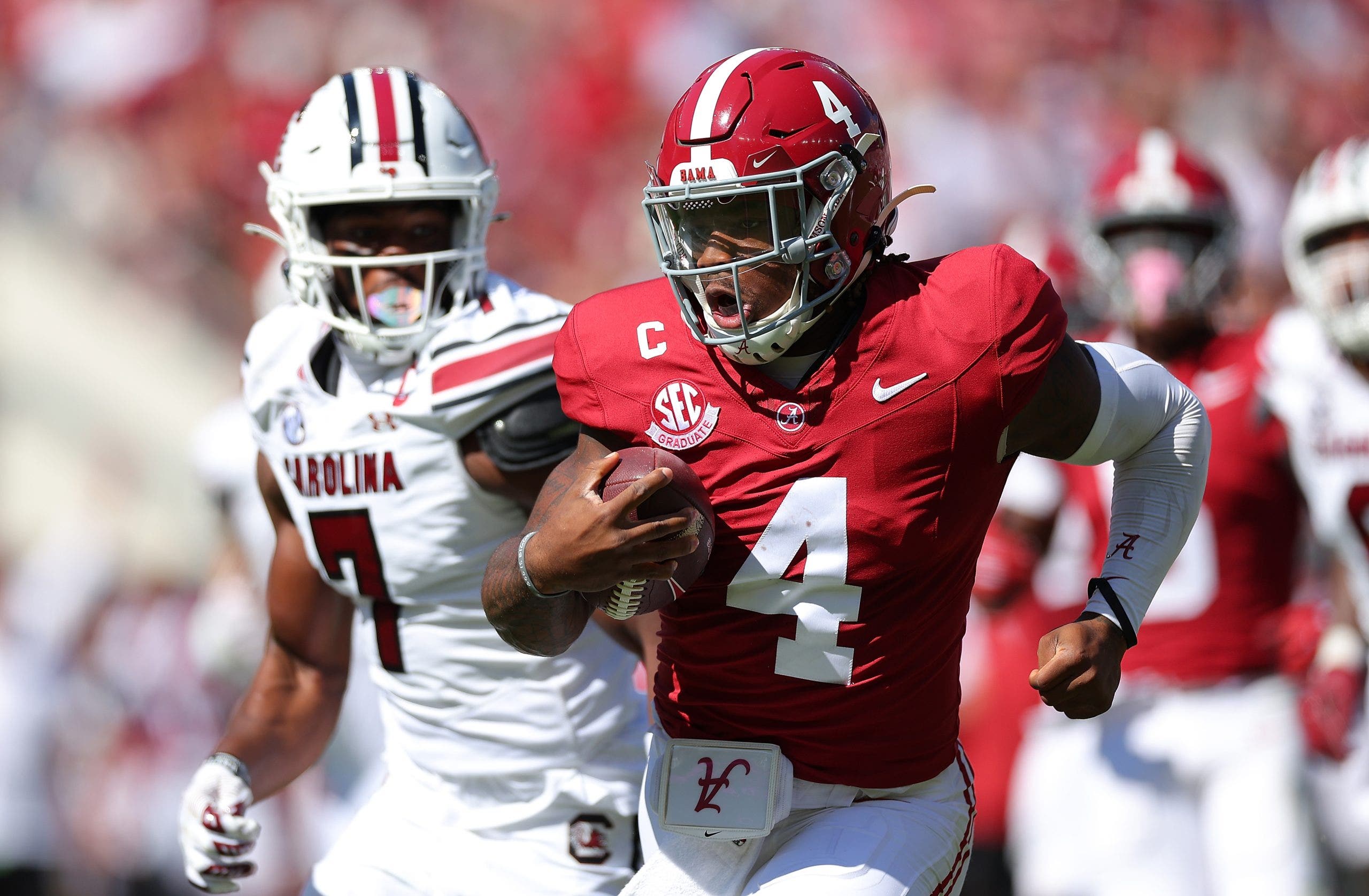 Jalen Milroe was on the move often in Alabama’s win over South Carolina, rushing for two touchdowns.
